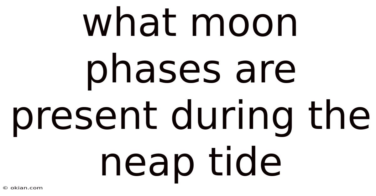 During neap tides, the Moon is either in First Quarter or Third Quarter. These are the only two phases where the Moon is 90 degrees away from the Sun in the sky, forming the right‑angle geometry essential for neap conditions. Because of this, the moon phases present during neap tide are precisely the quarter phases—both the waxing and waning quarters.